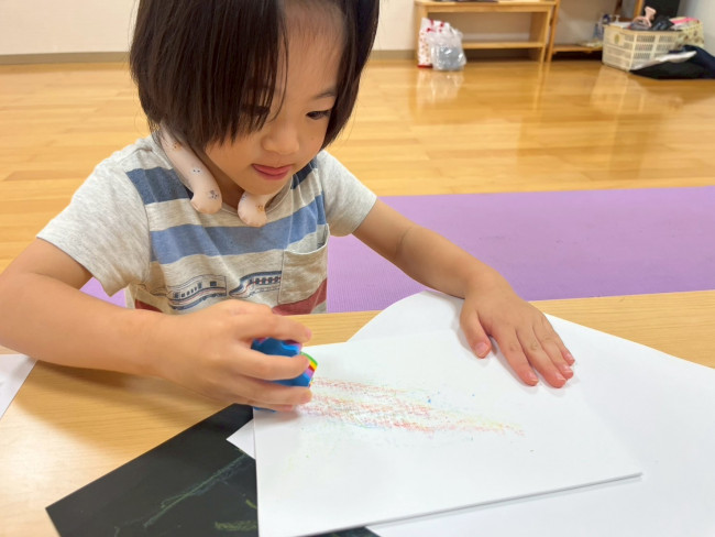 しおんくんは黒い画用紙にクレヨンで描きながら、「花火みたい!おうちでこの前した!」と教えてくれました🎆