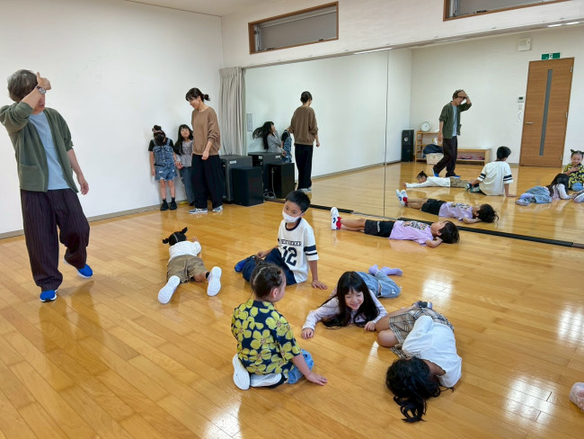 "レッスンでは、「宝箱をもらったあきちゃあと、はるくん。その宝箱をはなちゃん(犬)が盗んでしまう」