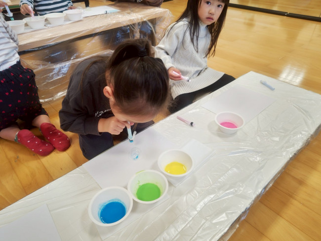 「見て!色が混ざった!」という元気な声も聞こえ、みんな自由に色を楽しむ様子がとても印象的でした。
