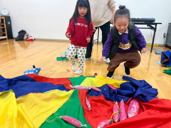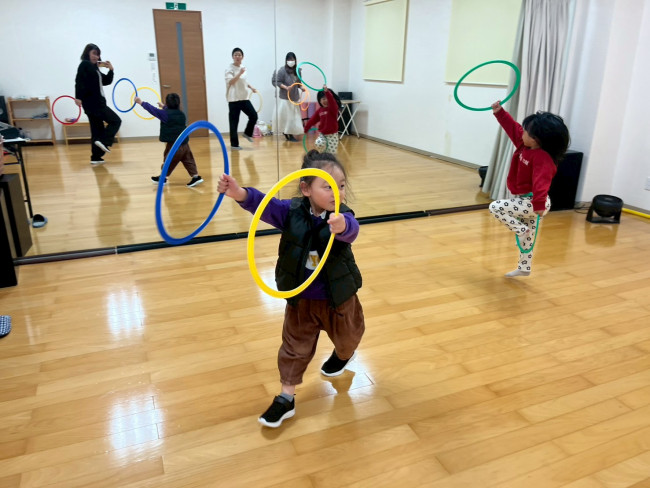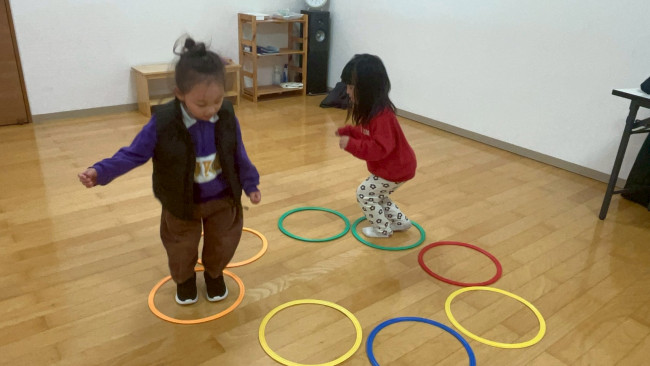 フープを並べてジャンプしながら、リズムに合わせて楽しい時間を過ごしました✨