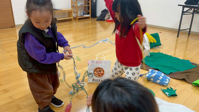 長い紐のお芋は二人で協力して引っ張り、たくさんのお芋がついてくると嬉しそうに手を伸ばしていました。