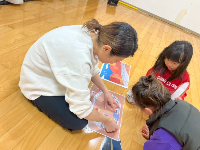 線路の描かれたパネルでは、電車を走らせる活動にも集中して取り組み、じっくり遊ぶ時間になりました🚃