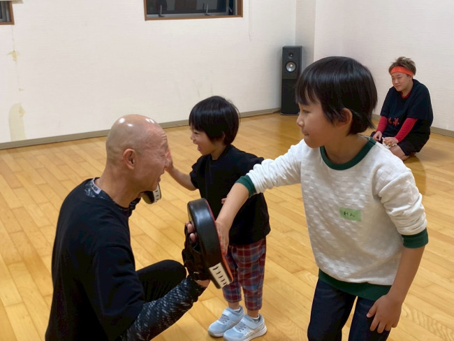 空手の時間では、肩まわりや股関節をゆっくりほぐす体操を行ったあと、前回の突きの復習へ。