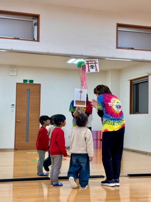 メロディが止まったら輪っかの中に入るあそびや、初詣のお話から発展したお参りごっこを行いました⛩️