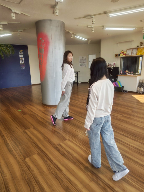 「歩く→ポーズ→鏡の前まで歩く→鏡の前で決めポーズ→振り向いて戻る」という流れを繰り返し、動きの流れを確認しました。