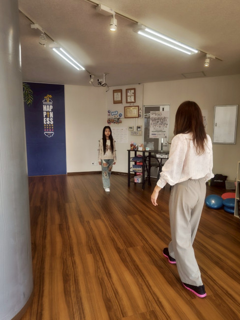 身体の準備が整った後は、鏡の前で姿勢を確認し、床の目印に沿ってまっすぐ歩く練習を繰り返しました。